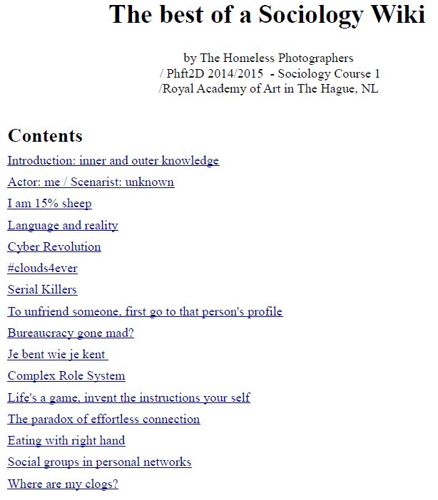 Published 29th January: Ebook / educational publication, available on request. Introduction to: The Best of a Sociology Wiki, by The Homeless Photographers / Phft2D 2014/2015 – Sociology Course 1/Royal Academy of Art in The Hague, NL.