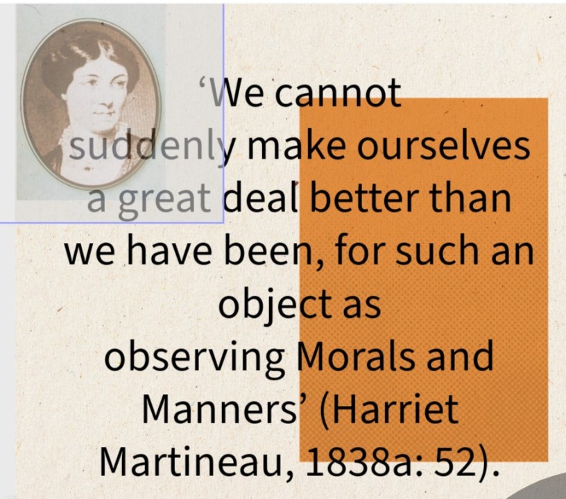 - First by emphasising the subject of the researcher. The scientist is not yet an institutionalised person but a free traveller who, as her list of required research skills later shows, can train herself to observe better. Martineau thus develops her argument from the perspective of the spontaneously observing traveller to the more skilled observer.