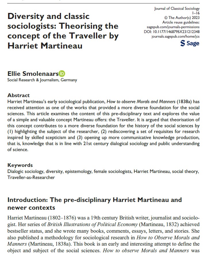 Smolenaars, E. (2023). Diversity and classic sociologists: Theorising the concept of the Traveller by Harriet Martineau. Journal of Classical Sociology, 0(0). Online first. https://doi.org/10.1177/1468795X231212348