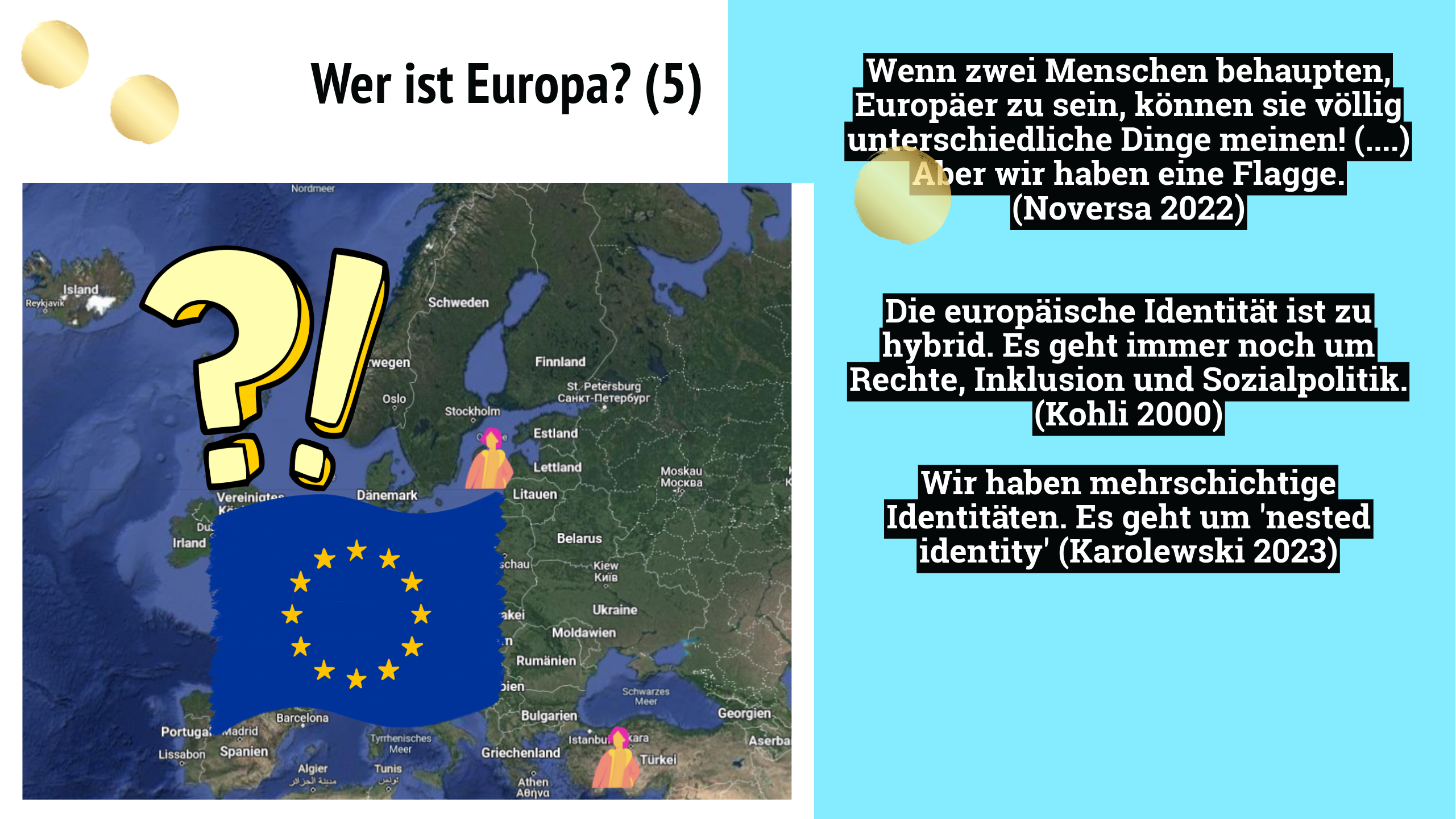 Aus Portugal berichtet Daniel Noversa (2022). Er hat im Rahmen des Erasmus-Programms (dem Austausch- und Stipendienprogramm der EU) unter Studierenden geforscht und Gruppeninterviews durchgeführt. Ganz kurz zusammengefasst: Die Studierenden haben zweimal in ihrem Leben ein ‘Euro-Ereignis’ erlebt, 2008 die Finanzkrise und 2015 die Migrationsereignisse. Sehr ehrliche Gespräche und auch Probleme werden angesprochen. Man fühlt sich oft mehr als Worldcitizen, als Weltbürger, und wenn zwei Menschen sagen, sie sind Europäer, dann können sie damit ganz unterschiedliche Dinge meinen. Aber wir haben eine Flagge. Die europäische Identität ist also polyedrisch.