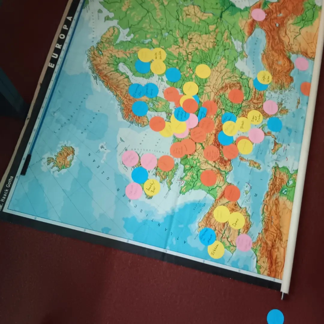 Vortrag Volkshochschule (vhs) Ehm Welk, 23.05.2024, Schwerin, Germany. Für die Unterstützung und Zusammenarbeit möchte ich mich bei der vhs herzlich bedanken. Der Vortrag mischte Wissensbausteine mit biografischen Erfahrungen. Gemeinsam legten wir Karten auf eine alte Europakarte aus dem Fundus (siehe Bild): Wer ist Europa? Welches Wort fällt Ihnen dazu ein? Schreiben Sie ein Wort auf eine Karte. Es kann ein Ort sein, Arbeit, Urlaub oder Geschichte, ein Moment in Ihrem Leben, ein Auslöser in Ihrer Biografie. Es kann alles sein, Sie haben 7! Karten. Wenn Sie 7 Wörter haben, kommen Sie und legen Sie sie auf die Karte. Fragen Sie Ihren Nachbarn, warum, wieso, was ist passiert?